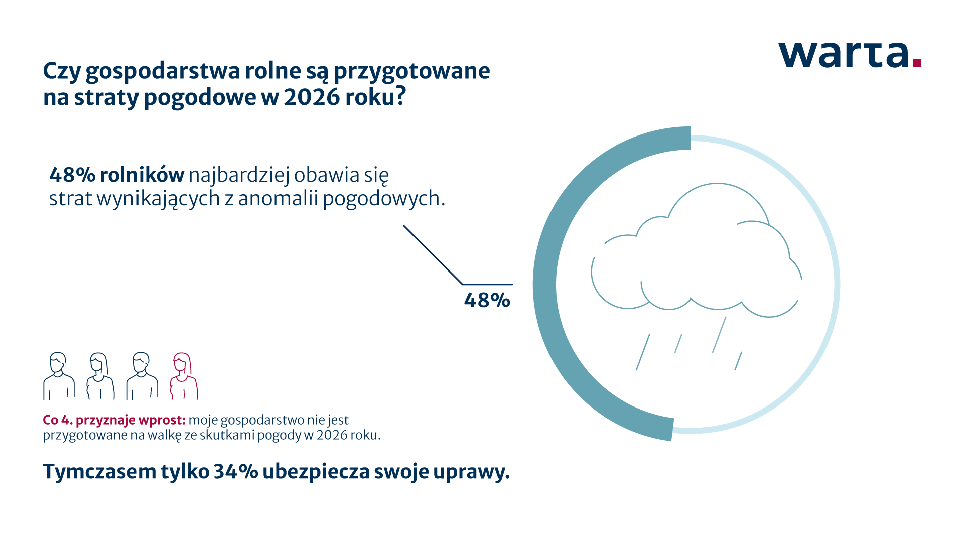 – Wyniki tegorocznego badania mogą budzić nasze obawy jako ubezpieczycieli. Wciąż duża część rolników nie ubezpiecza swoich upraw przy jednoczesnym poczuciu ogromnego zagrożenia pogodowego. Pokazuje to dużą lukę w strategicznym zarządzaniu ryzykiem – mówi Joanna Chudzik, ekspertka ubezpieczeń upraw w Warcie. – Tegoroczna zima dobitnie udowodniła, że pogoda wciąż potrafi nas zaskakiwać i to pod wieloma względami. W dobie tak dużej zmienności klimatycznej samo obowiązkowe ubezpieczenie to często za mało. Aby realnie chronić swój warsztat pracy, rolnicy powinni stawiać na kompleksowe rozwiązania. Takie, które uwzględniają ryzyka dodatkowe (np. deszcz nawalny, huragan, zastoiska wodne), pamiętając jednocześnie, aby polisa odpowiadała realnej rynkowej wartości plonów. Tylko takie podejście pozwala odzyskać stabilność finansową po wystąpieniu szkody, które, jak pokazują dane, dotykają wielu polskich właścicieli gospodarstw.
